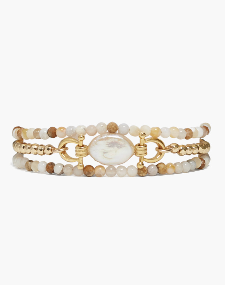 Naked wrap bracelet featuring brioche agate, picture jasper, mother of pearl, hematine, and 18K gold plated sterling silver hinged detail with freshwater pearl centre.