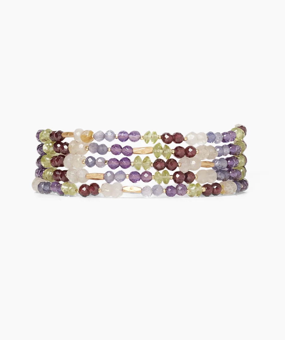 This naked wrap bracelet features a colorful mix of iolite, peridot, amethyst, garnet, rutilated quartz, and glittering gold accent beads. The different shapes and textures of natural gems adds depth to layered looks.