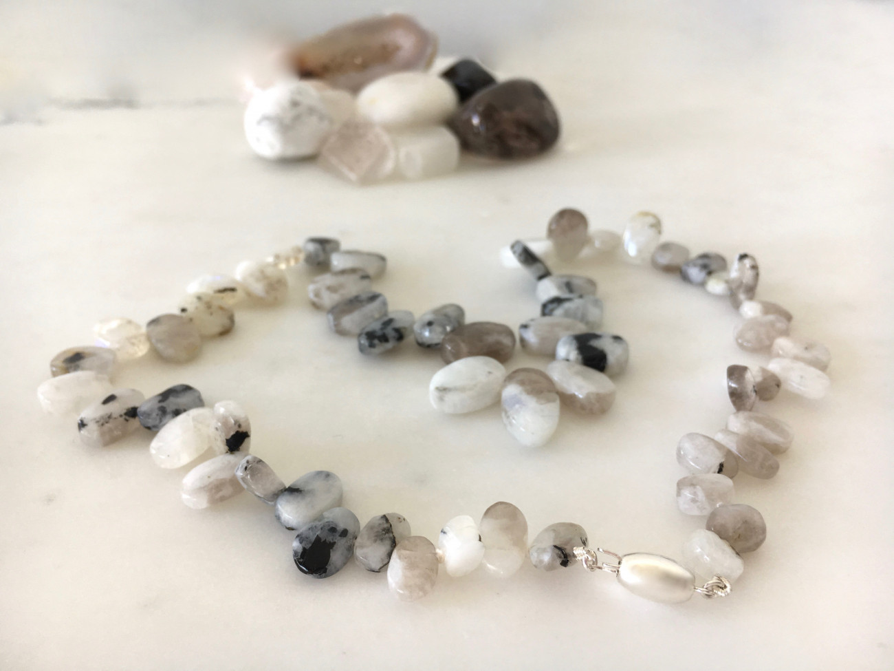 These organic shaped, highly polished moonstone beads are mesmerising with their contrasting flecks of black, white and rainbow flash. Stunning original necklace threaded on white silk. 42 cm in length. 925 sterling silver push clasp.