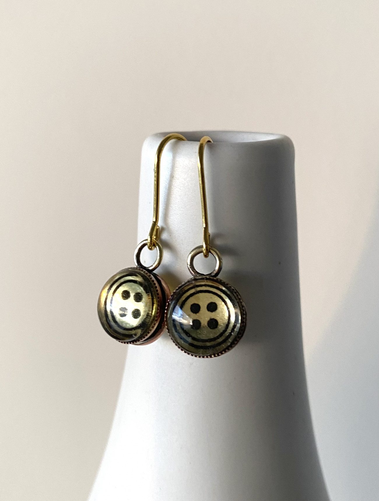 Bambina double sided earrings with button motif over shiny gold on front side. Gold on reverse. 10mm round with french hook.