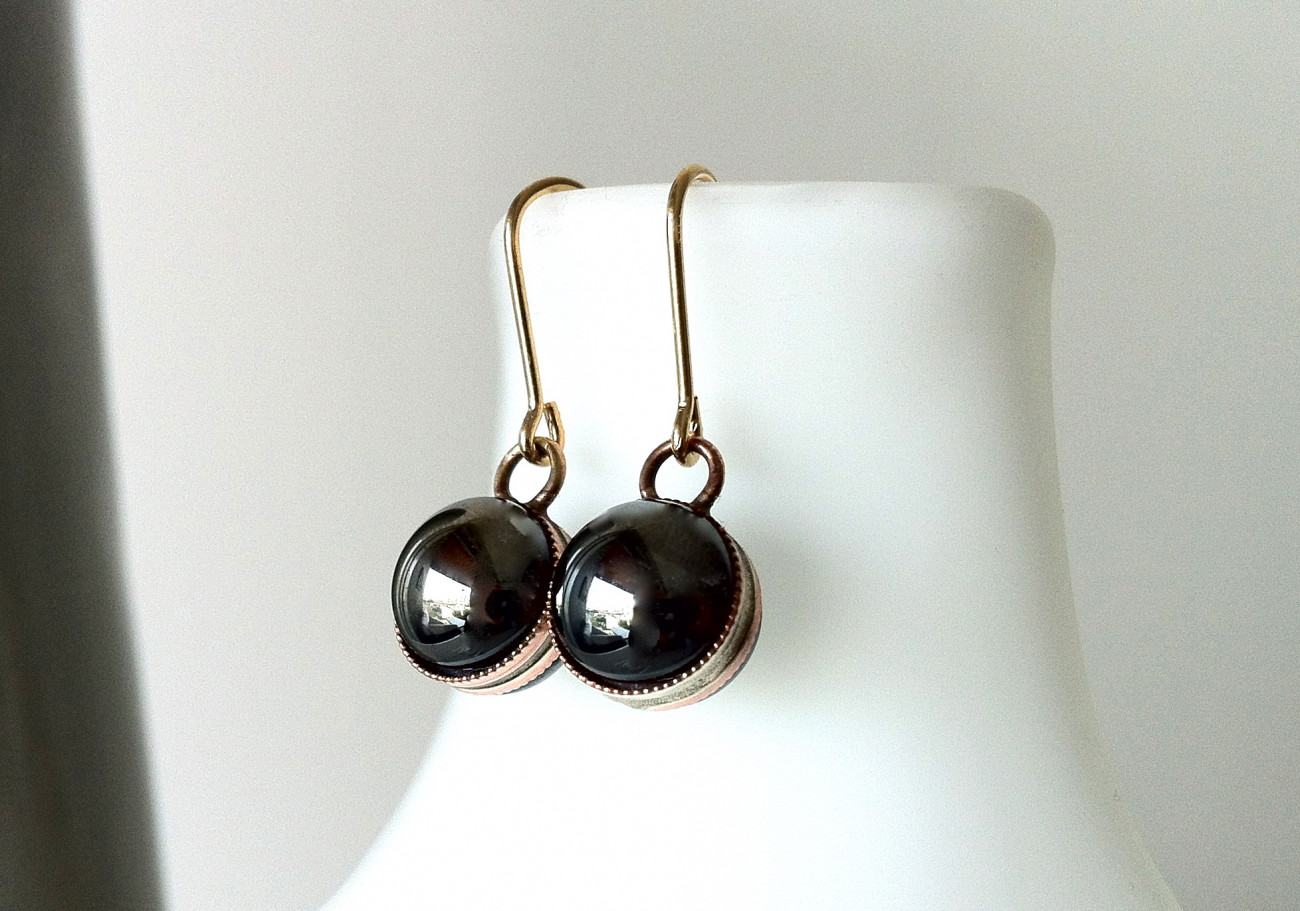 Double sided hook earrings with black pearl crystal on front and reverse. Setting 10mm diameter.