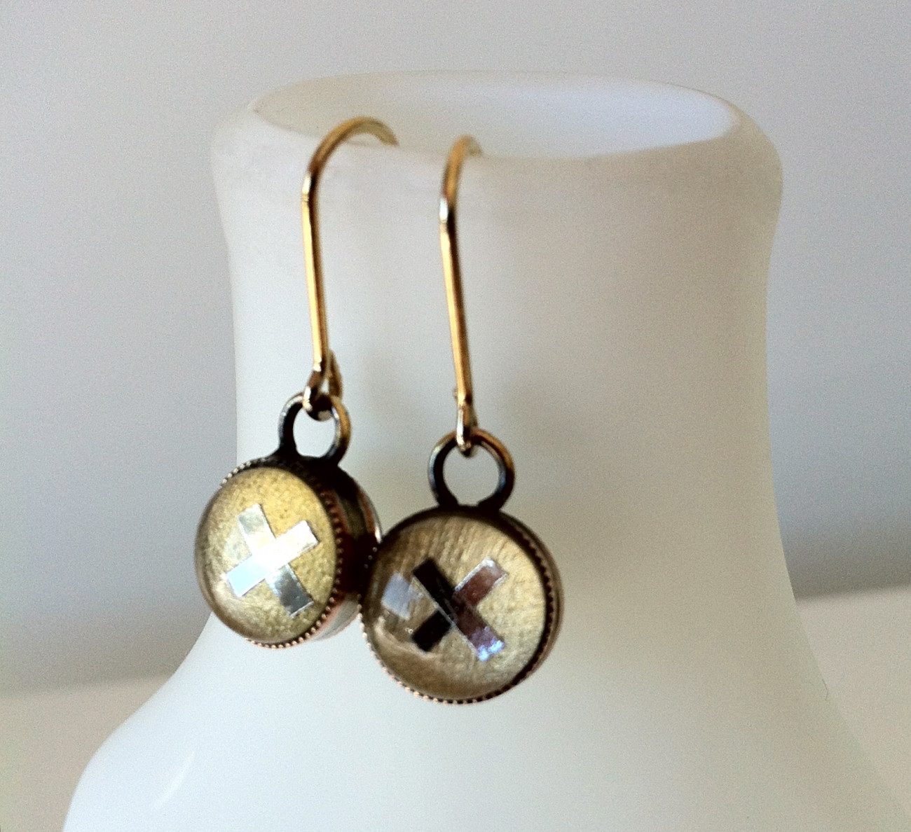 Double sided Bambina Earrings with a scratched gold background and silver kiss. Silver crystal on reverse. Setting 10 mm diameter.