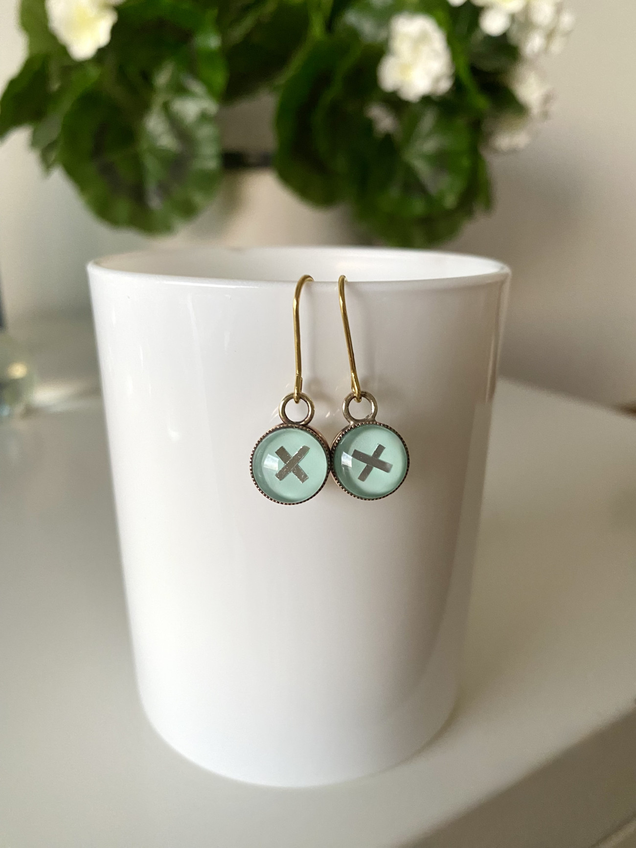 *New colour option* Soft aqua seafoam Bambina earrings with silver kiss motif. 10mm in diameter.