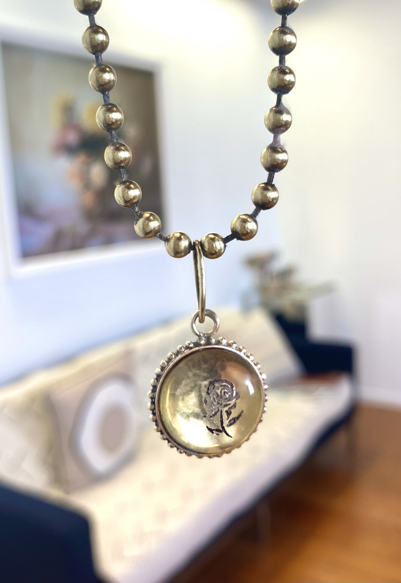 New style beaded globe with sandblasted Italian crystals set over reflective gold. Hand soldered beaded setting and chunky ball chain. One side sandblasted and darkened rose motif and reverse sandblasted diamond. Made in the LH workroom.
