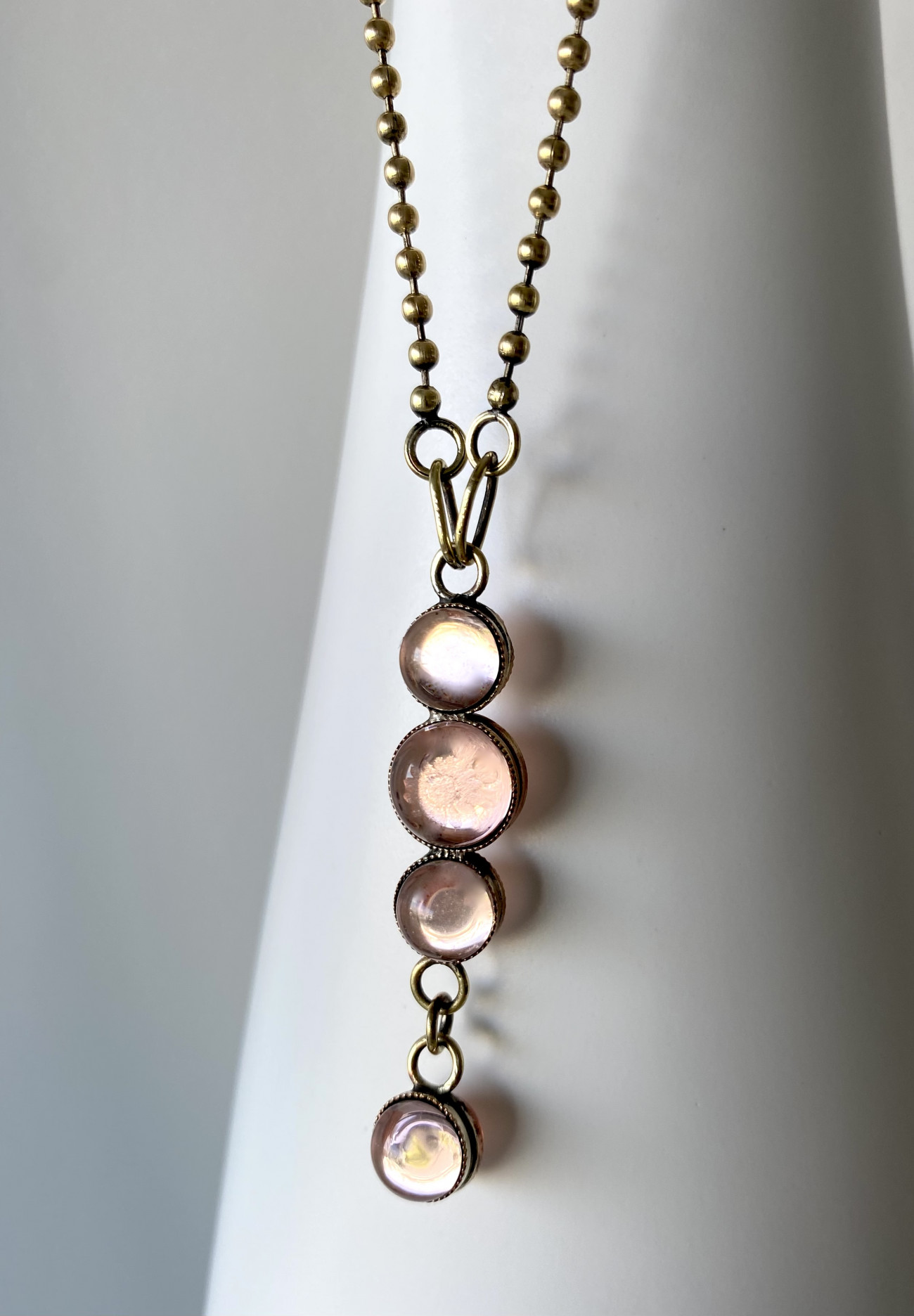 Reflective and tactile this pendant is soldered by Lisa at her Auckland workbench, it features 8 settings with sandblasted and champagne pink crystals. Ball chain 60cm in length.