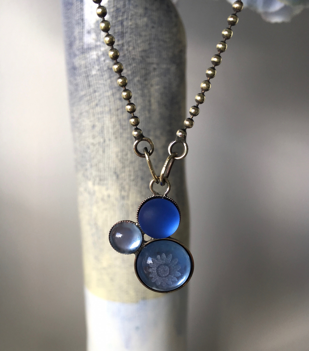 Three round settings in various sizes make up this easy to wear short style necklace. 14mm,10mm,8mm set with light sapphire blues and a sandblasted motif on larger stone. 45cm chain antiqued brass ball chain.