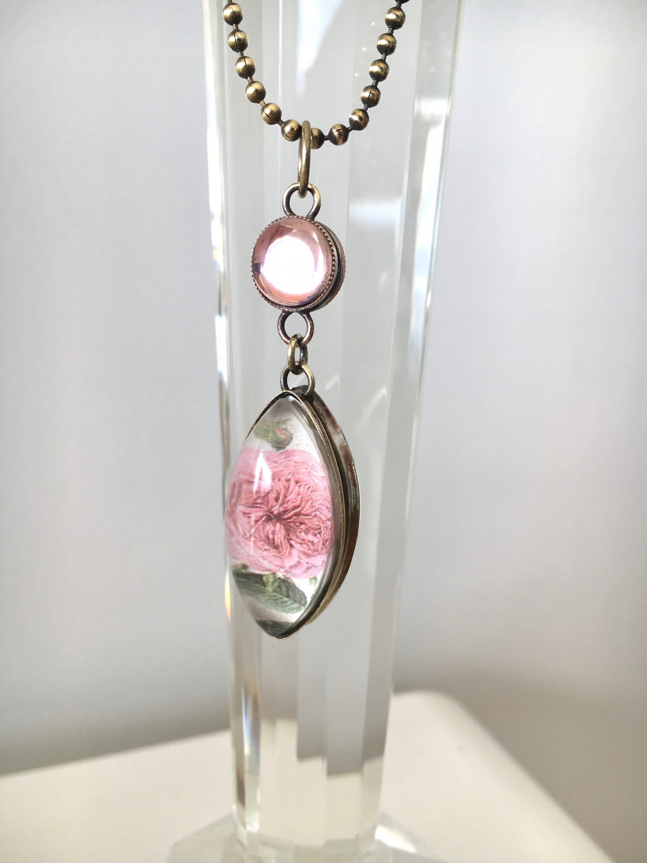 Stunning double sided pendant with smokey pink rose imagery in the large marquise and champagne pink in the small round cabochon. 88 cm chain