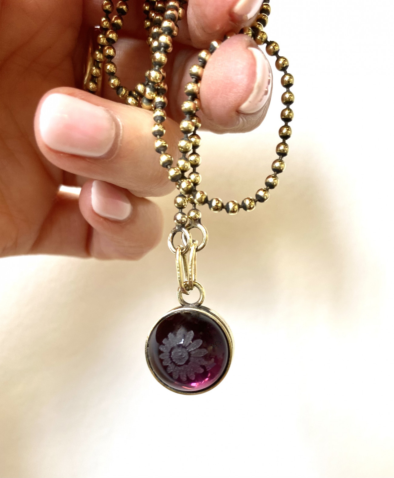 Double sided petite globe with a sandblasted daisy and diamond motifs in dark amethyst.