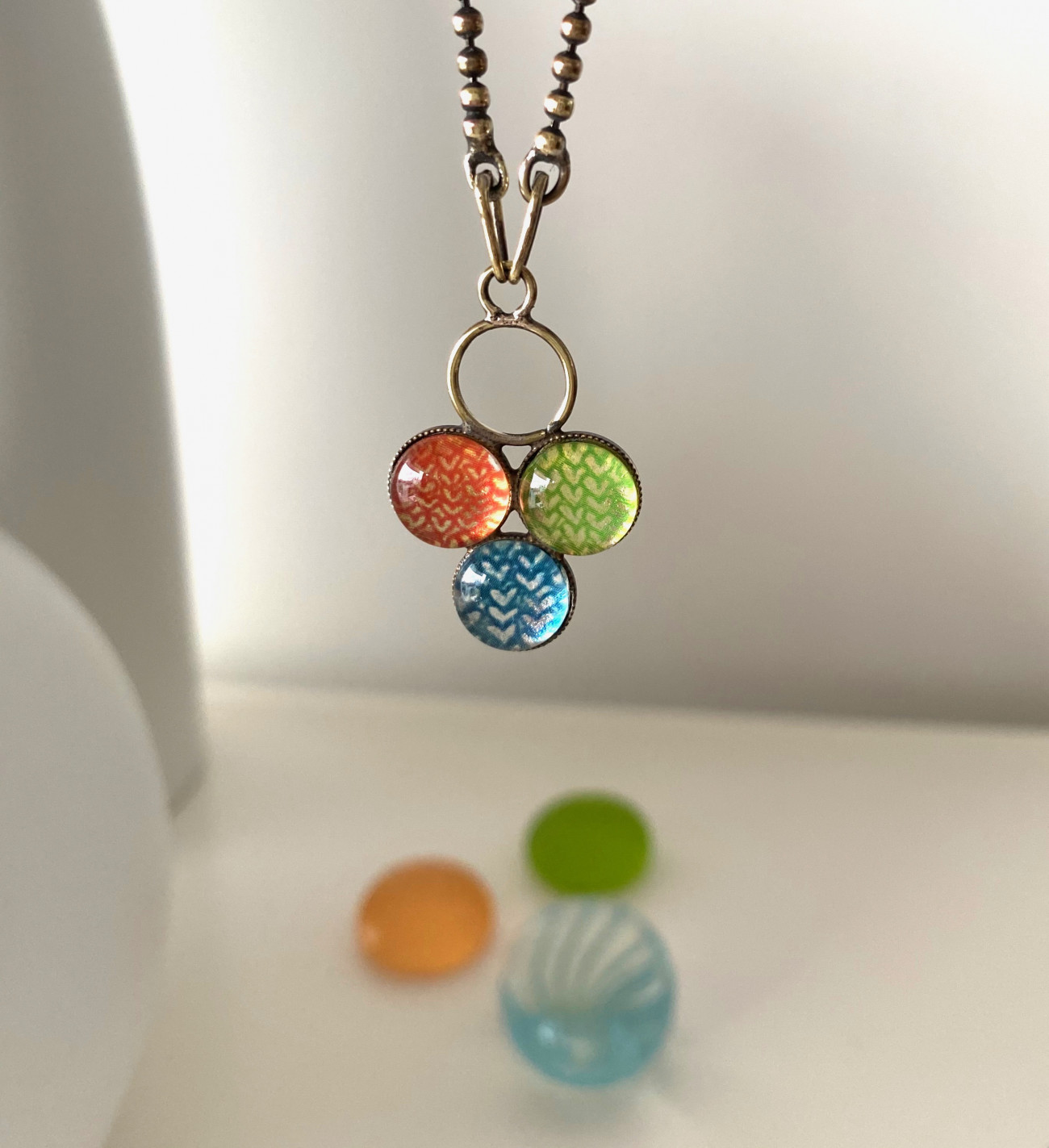This unique pendant from the Love Note collection features a hand drawn hearts pattern over gold and silver. Hand hewn antiqued brass setting with european crystal globes. 45cm in total length.