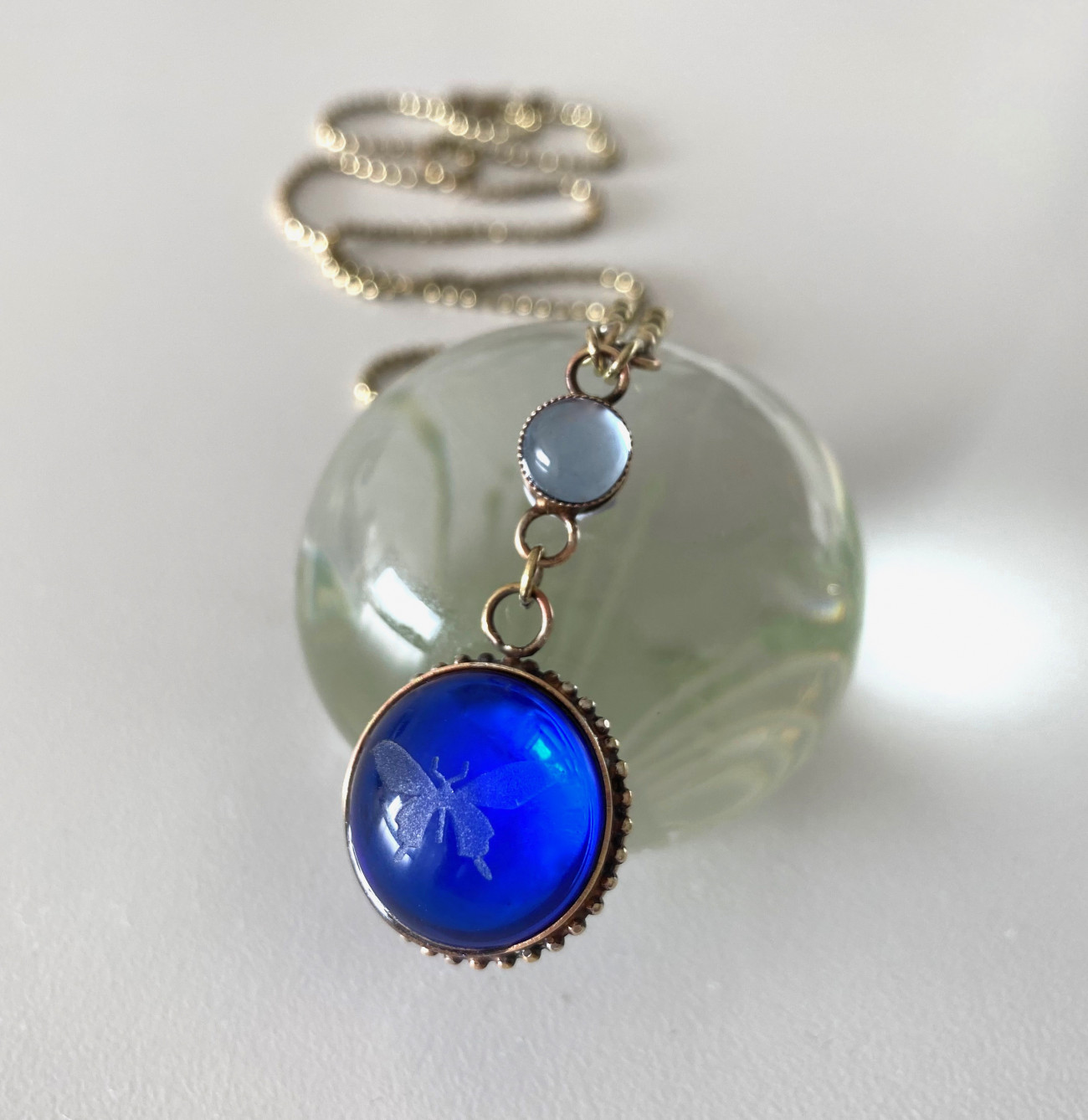 Vibrant hand soldered pendant features a double sided setting with sandblasted butterfly and daisy on dark sapphire italian crystals. Antique brass chain 88cm in total length. Main globe 20mm in diameter. Smaller globe 8mm diameter