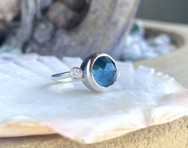 Round rosecut London Blue Topaz ring set in 14k white gold with 925 sterling silver freeform band. Fall in love with the deep sea blue of this special ring.