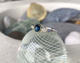All the blues with this new one! London Blue Topaz, Diamond and Sapphire combo set in a 14k yellow gold bezel roll-over setting with 925 sterling silver freeform band.