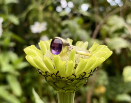 New vibrant Amethyst cabochon ring with diamond clusters set in 14k yellow gold with freeform 14k gold band.