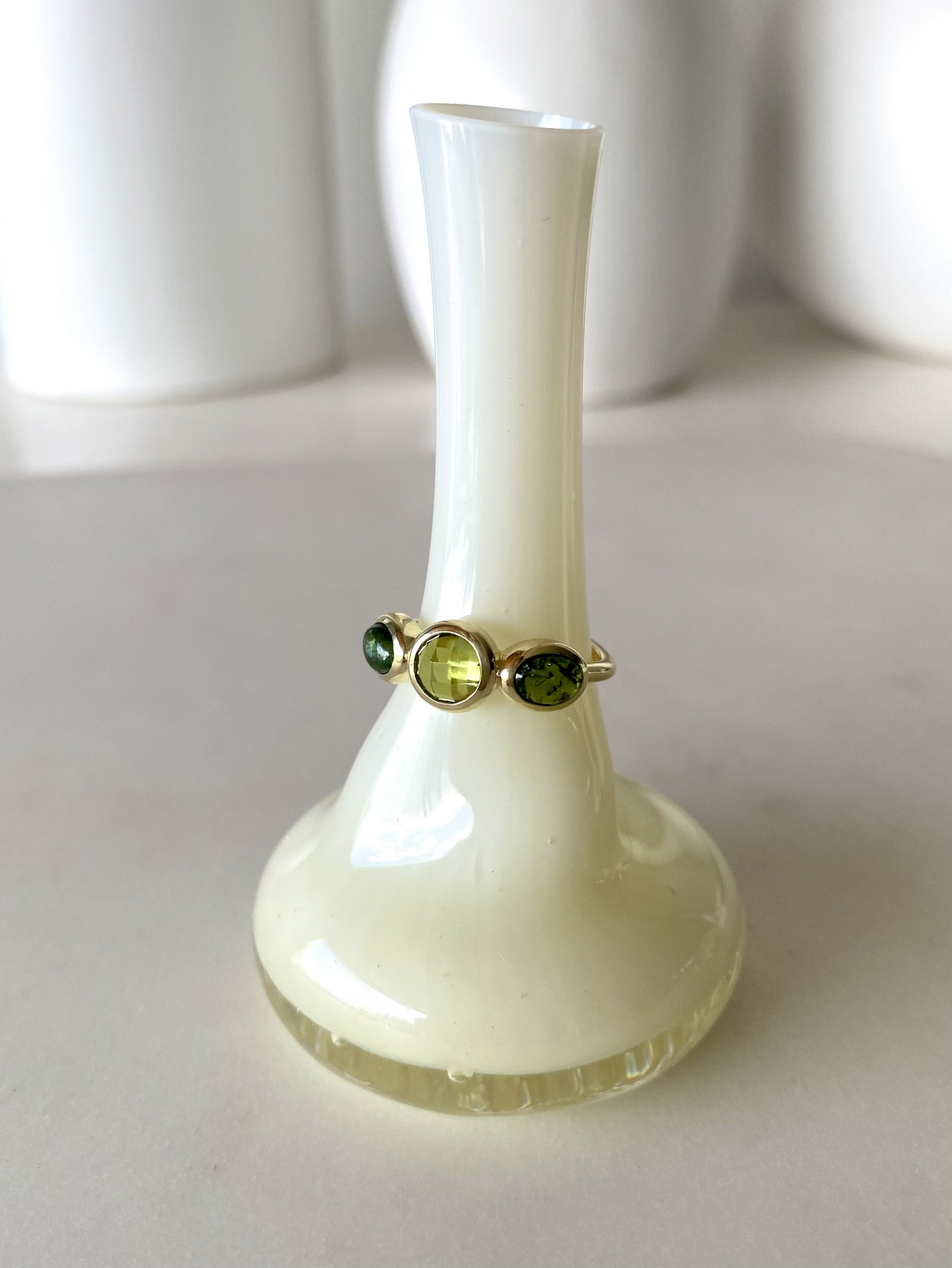 A green accent is always chic. This stunning rollover trilogy ring with bezel settings is so comfortable to wear. Sitting flat to the skin, the centre peridot is a sparkling checkerboard cut flanked by two deep green tourmaline ovals.