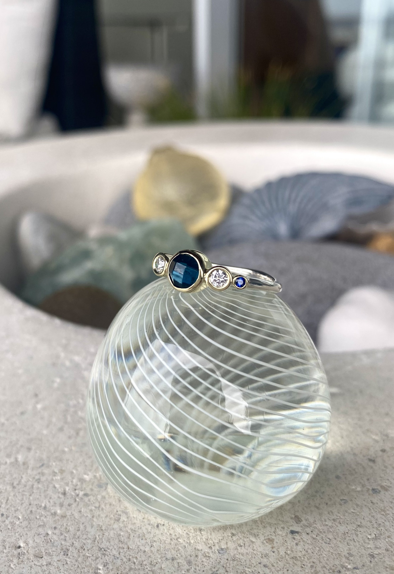 All the blues with this new one! London Blue Topaz, Diamond and Sapphire combo set in a 14k yellow gold bezel roll-over setting with 925 sterling silver freeform band.