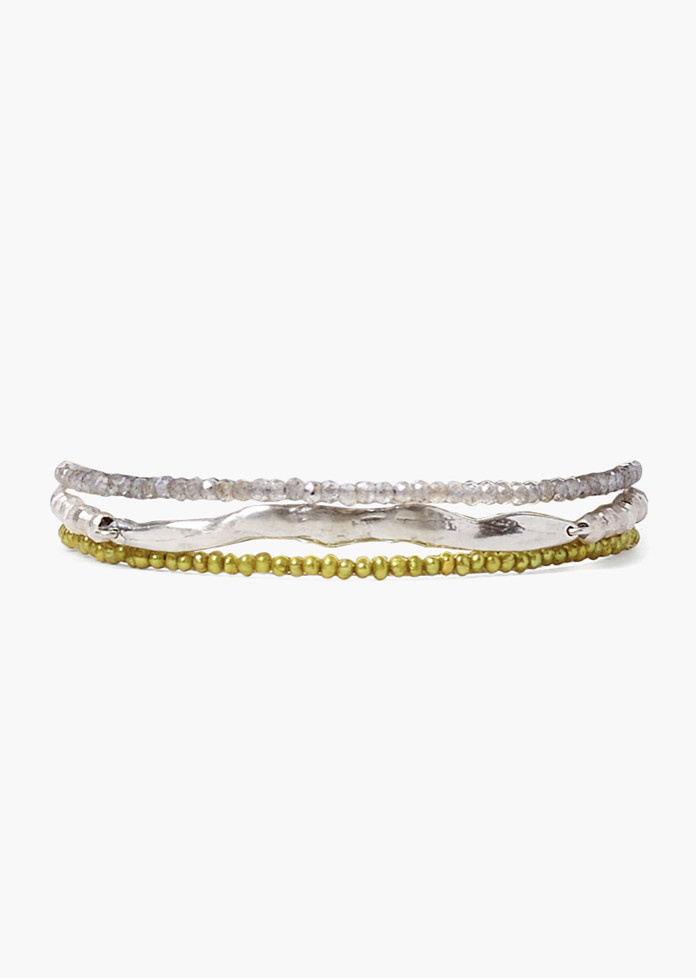 Naked wrap bracelet featuring lime pearls, mystic labradorite, and sterling silver bar and beads. 19 - 21in. length. Adjustable.